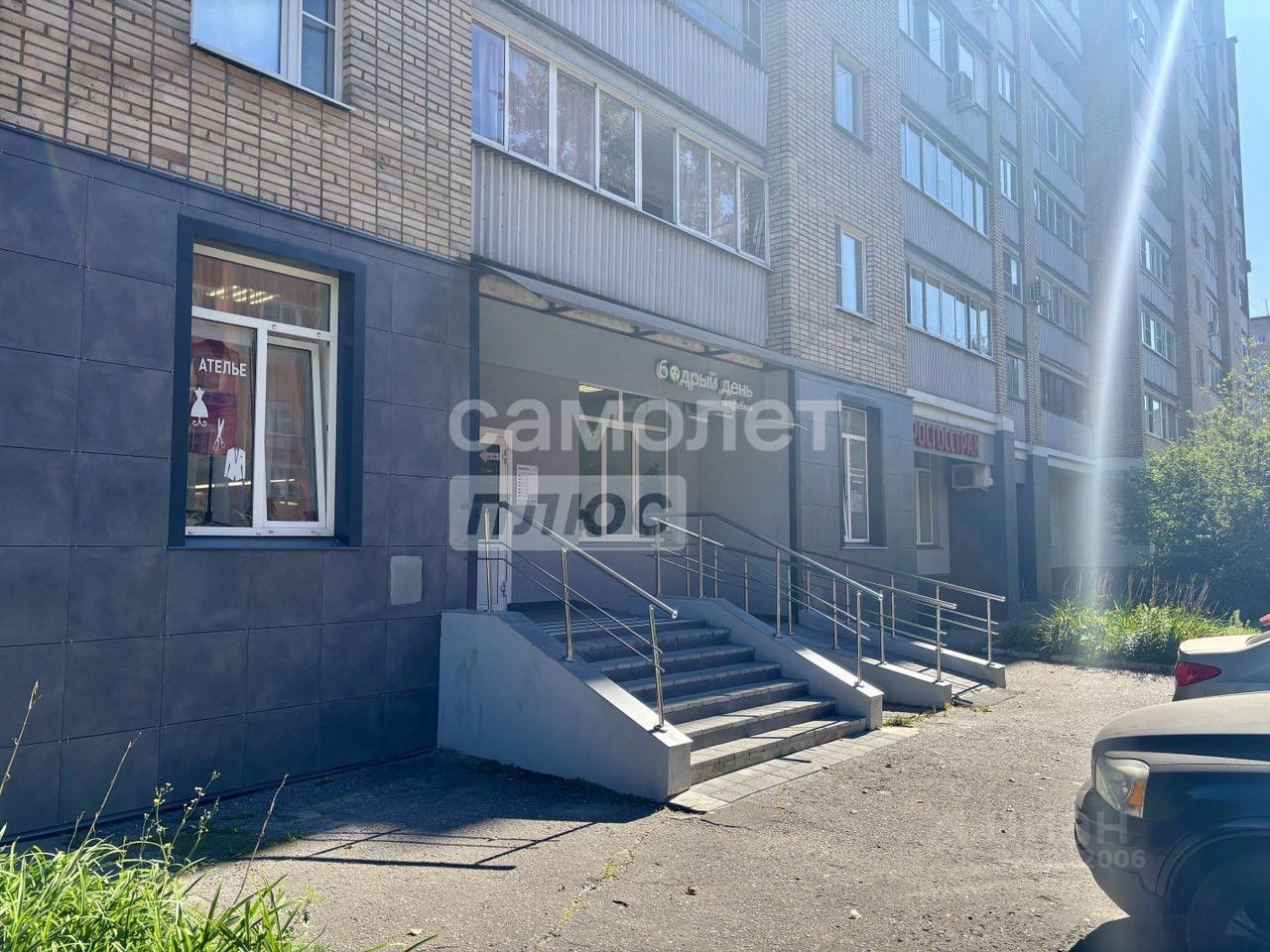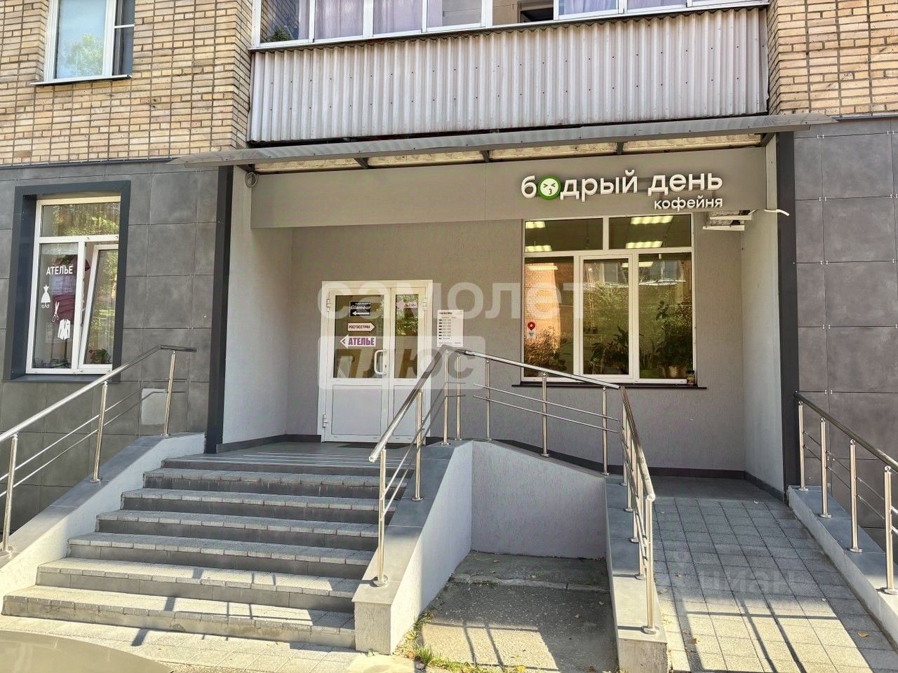 Отдельный вход с улицы с активным пешеходным и автомобильным трафиком в зоне плотной жилой застройки. Есть наземная парковка и пандус.