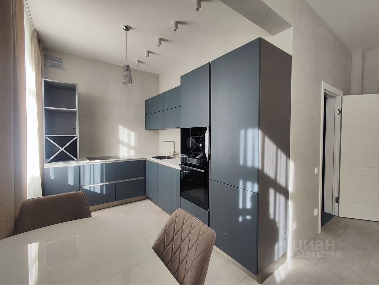На кухне установлен гарнитур, сделанный по индивидуальным замерам со встроенной техникой: холодильник, варочная панель, духовой шкаф, посудомоечная машина, микроволновая печь, вытяжка.